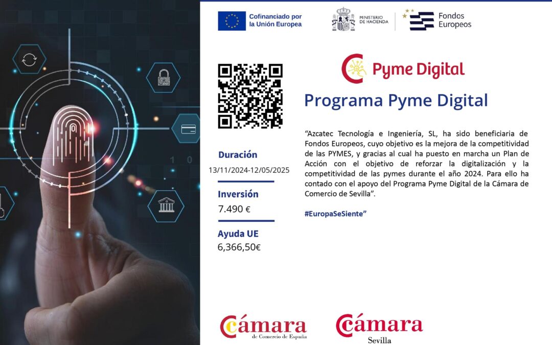 Azcatec Tecnología e Ingeniería, SL, ha sido beneficiaria de Fondos Europeos, cuyo objetivo es la mejora de la competitividad de las PYMES, y gracias al cual ha puesto en marcha un Plan de Acción con el objetivo de reforzar la digitalización y la competitividad de las pymes durante el año 2024. Para ello ha contado con el apoyo del Programa Pyme Digital de la Cámara de Comercio de Sevilla.